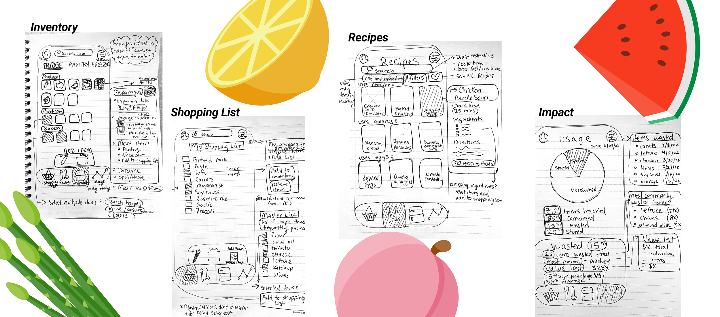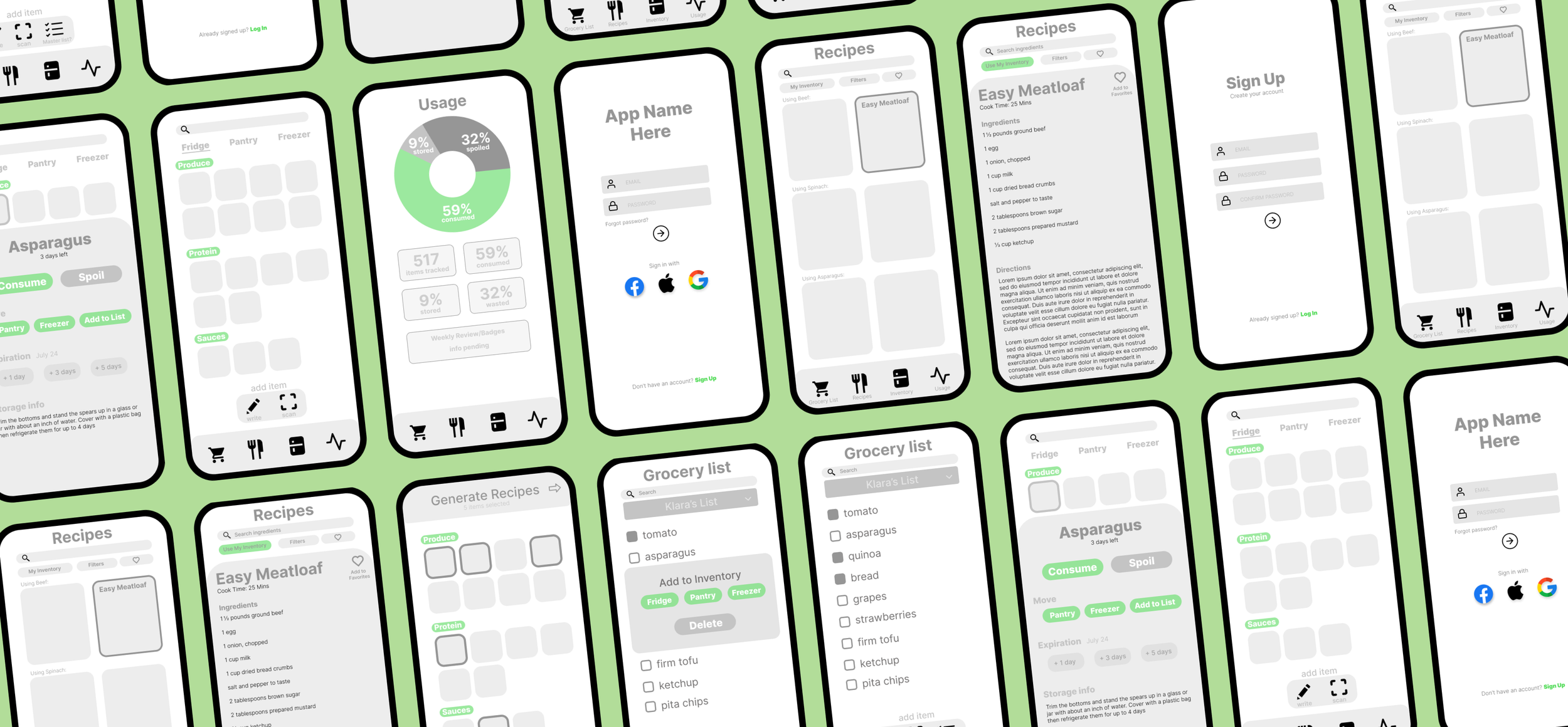 I compared five competitor apps that have a similar goal of helping people reduce their food waste. I found most of the apps had similar features available such as: Shopping list, Inventory and a barcode scanner to add items. Overall, the app experiences felt similar, bland and uninviting to use.