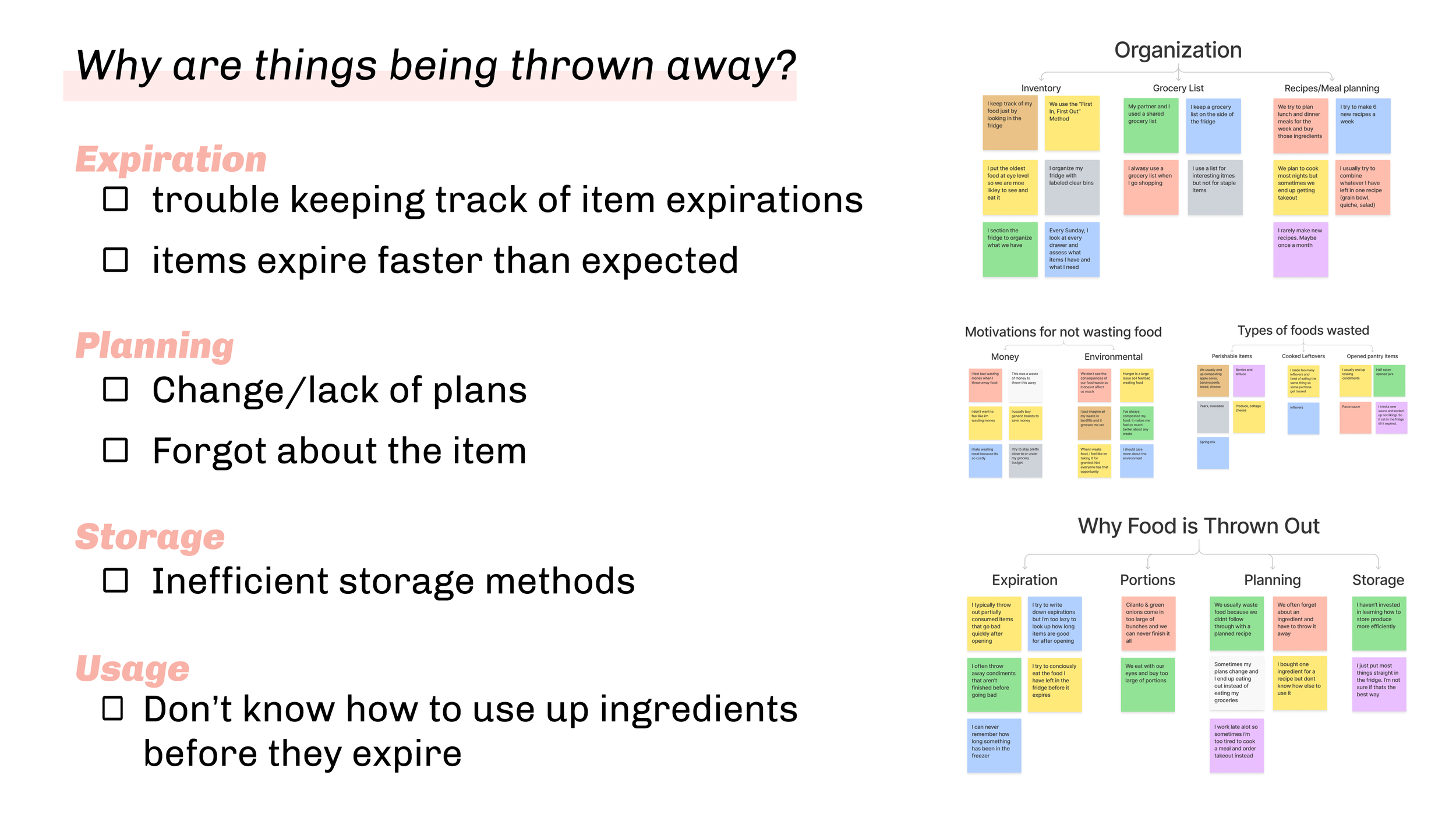 After collecting and organizing interviewee information using affinity mapping, I noticed some trends surfacing. These boiled down to four main categories of why food ended up being wasted: Expiration, Planning, Storage and Usage